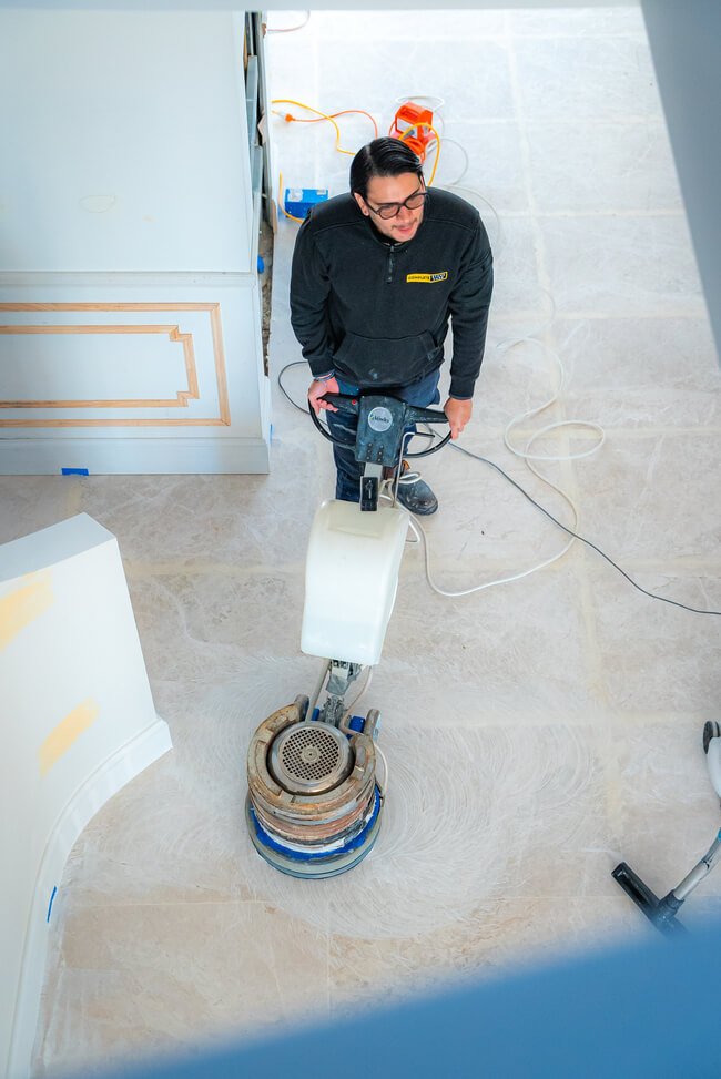 All floor polishing restoration or repair work requires pre inspections. The first step in our stone restoration process is a thorough inspection of your marble, granite, or limestone surfaces. We identify the type of damage—such as cracks, stains, or etching—and determine the best techniques to restore each specific stone. Obviously as you can see, no two jobs are ever the same when it comes to preparing various stone surfaces. Whether it’s a kitchen countertop, hotel lobby floor, or residential bathroom vanity, we tailor our approach to achieve optimal results or your requirements. Satisfied customers are happy customers.