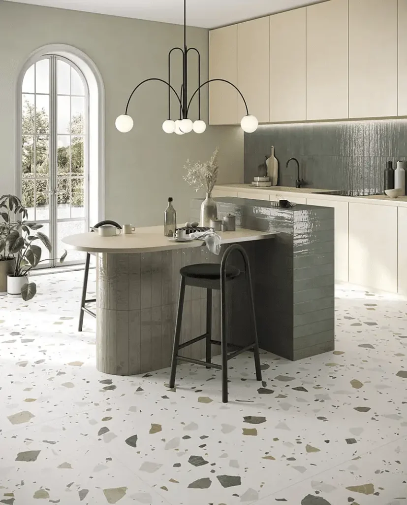 Terrazzo isn’t a single stone. It’s a composite of marble chips, and sometimes granite, quartz, or glass, bound together in cement or resin, then poured, ground, and polished as one surface.